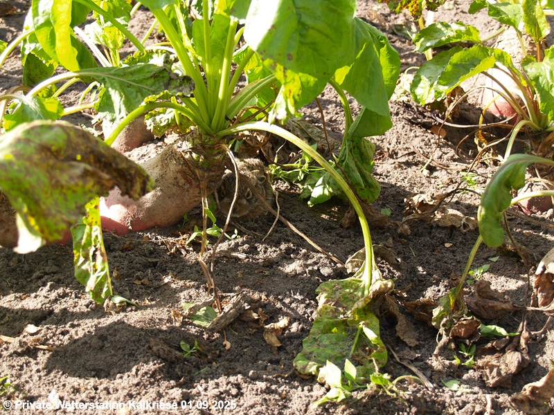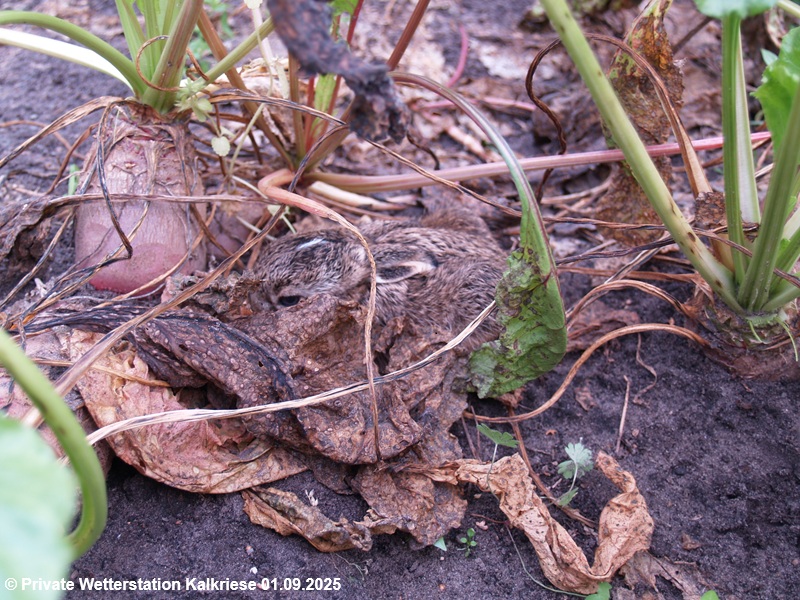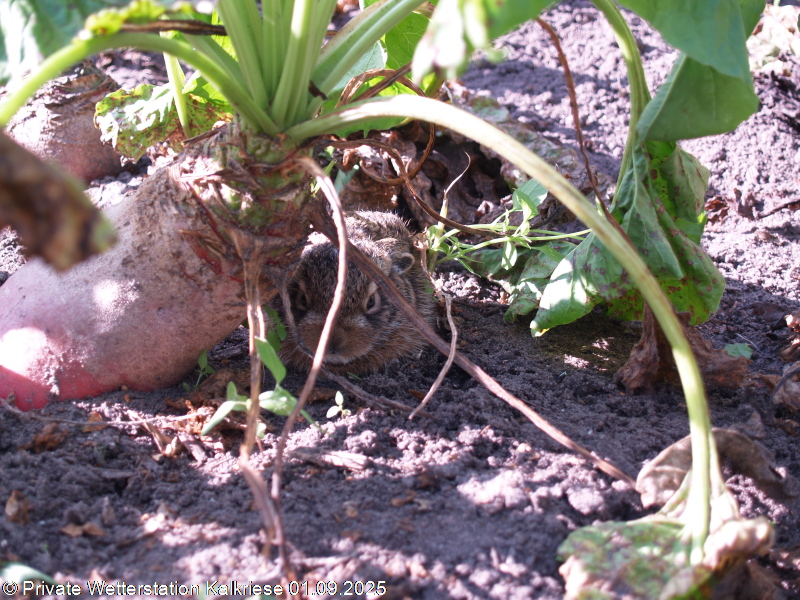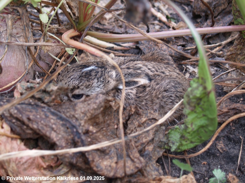 August 2025 Junges Wildkaninchen versteckt sich zwischen Runkelrüben | |||||